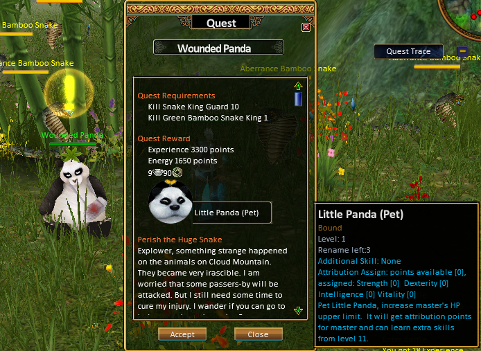 Wounded Panda is a special NPC located in Bamboo Forest, Cloud Mountain who provides a unique quest chain for players starting at level 10. This quest line introduces players to their very first pet, the [Pet] Little Panda, which will accompany them in their adventures.