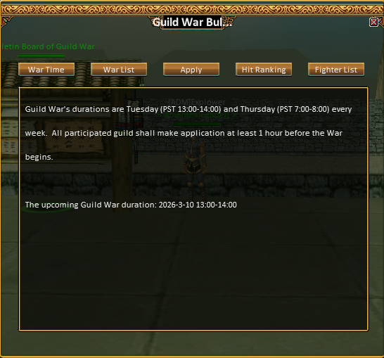 Bulletin Board of Guild War is a special system that allows guild leaders to declare and manage Guild Wars against other guilds. This board serves as the official interface where guild conflicts are registered and tracked.